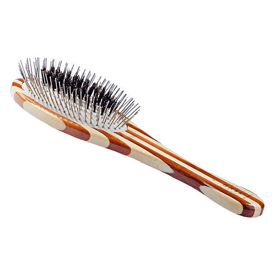 Jabalí puro + pines de aleación. El diseño innovador patentado de cerdas naturales de jabalí y pines de aleación en secciones separadas en la misma almohadilla del cepillo, proporciona un acondicionamiento más completo al permitir que las cerdas de jabalí que distribuyen el aceite alcancen las capas más profundas del manto
